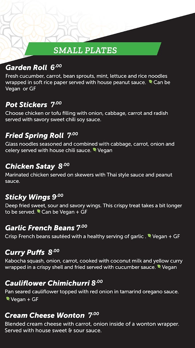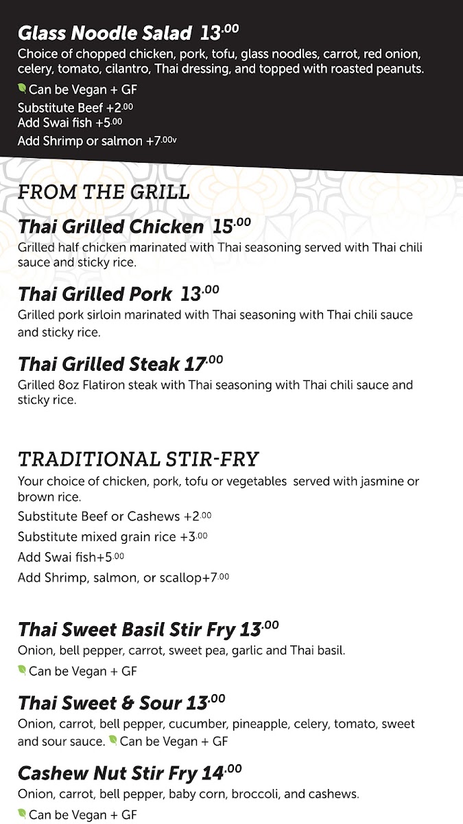 Choice of protein, shredded carrots, red onions, mint, scallions, cilantro, roasted ground rice, Thai dressing, served with sticky rice.