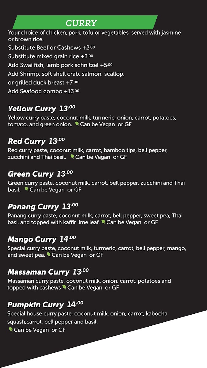 Spicy. Choice of protein. House special curry paste, coconut milk, kabocha, carrots, bell peppers, and Thai basil. Served with jasmine or brown rice.