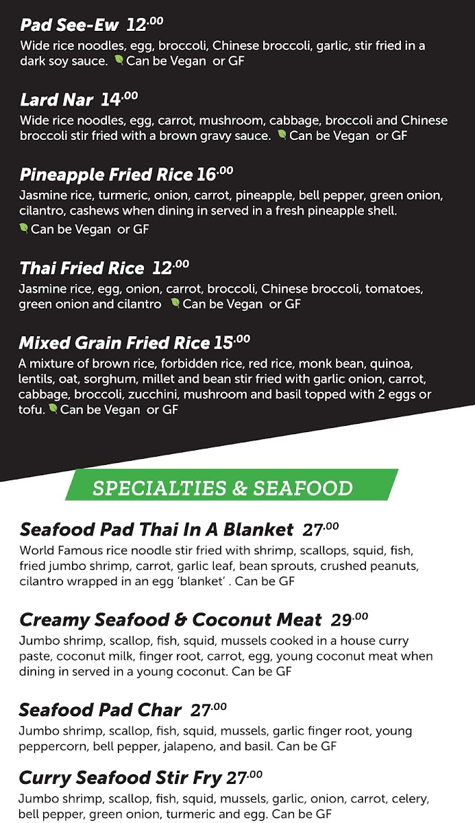 Thailand’s famous soup! Choice of chicken or tofu, coconut milk, fresh coconut juice, galangal, lime leaf, lemongrass, carrots, cabbage, mushrooms, young coconut meat, and cilantro.